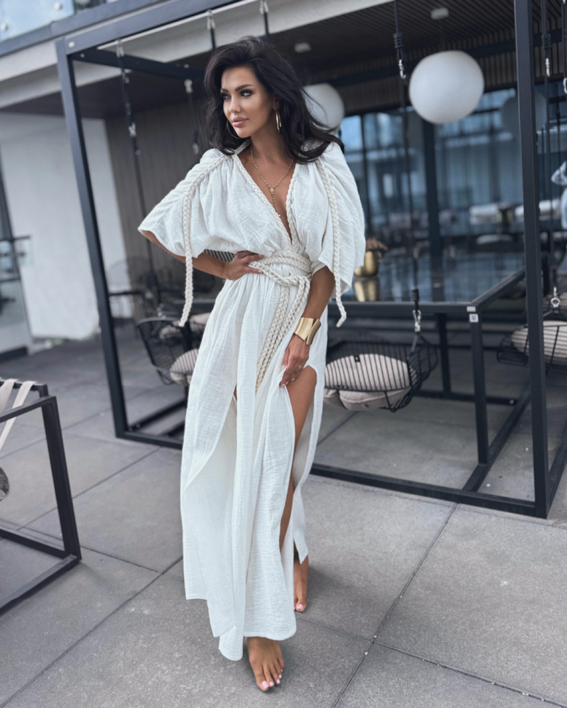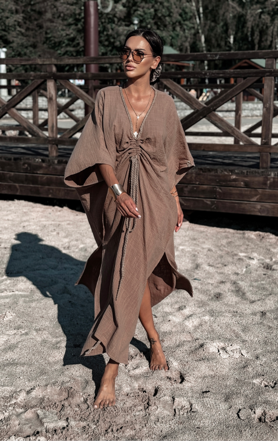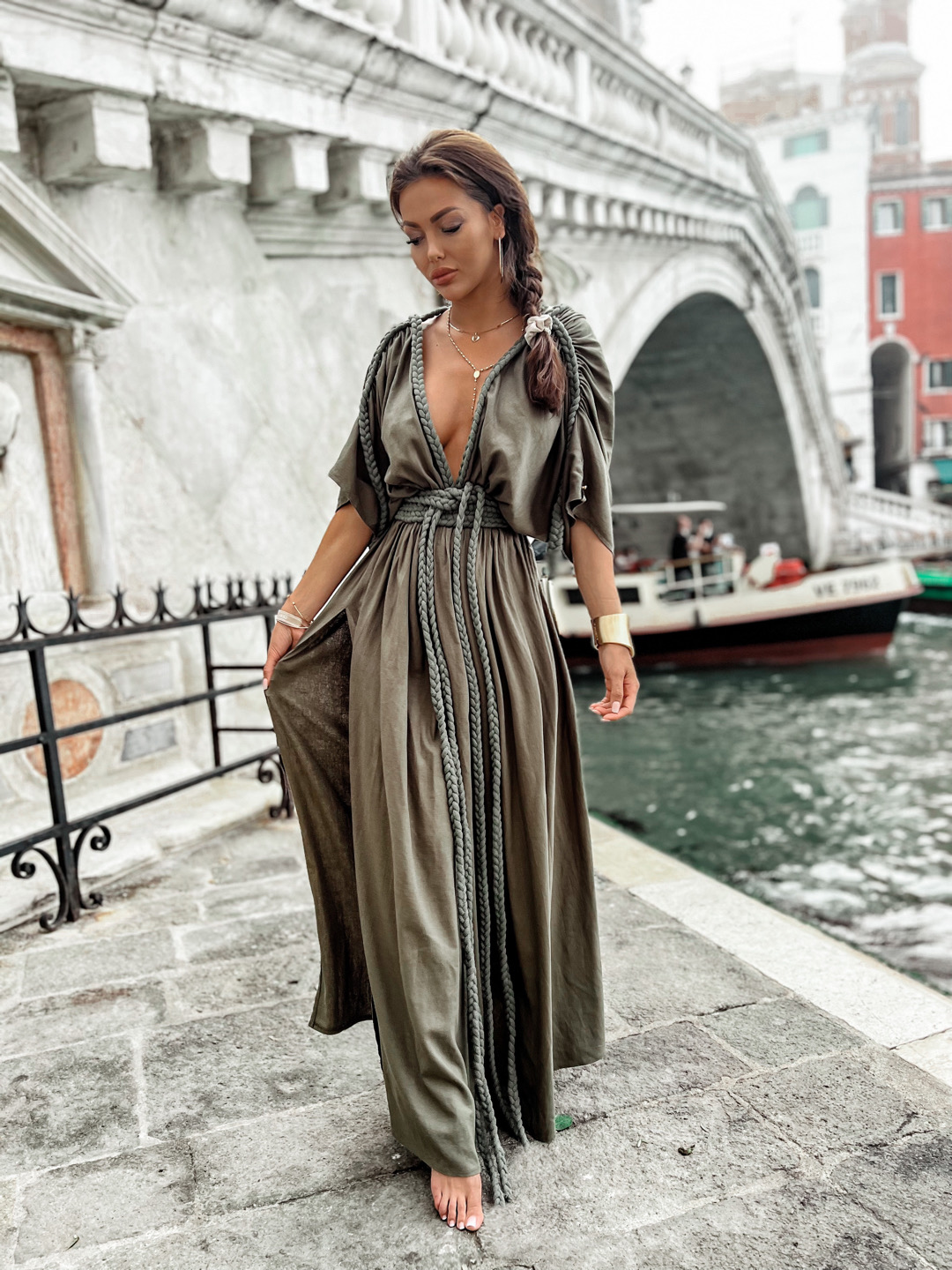 Sukienka maxi wykonana z lnu, z dodatkiem wiskozy. Pięknie się układa dzięki gumce w pasie, przeplatana przyszytym warkoczem w pasie ręcznie robionym.