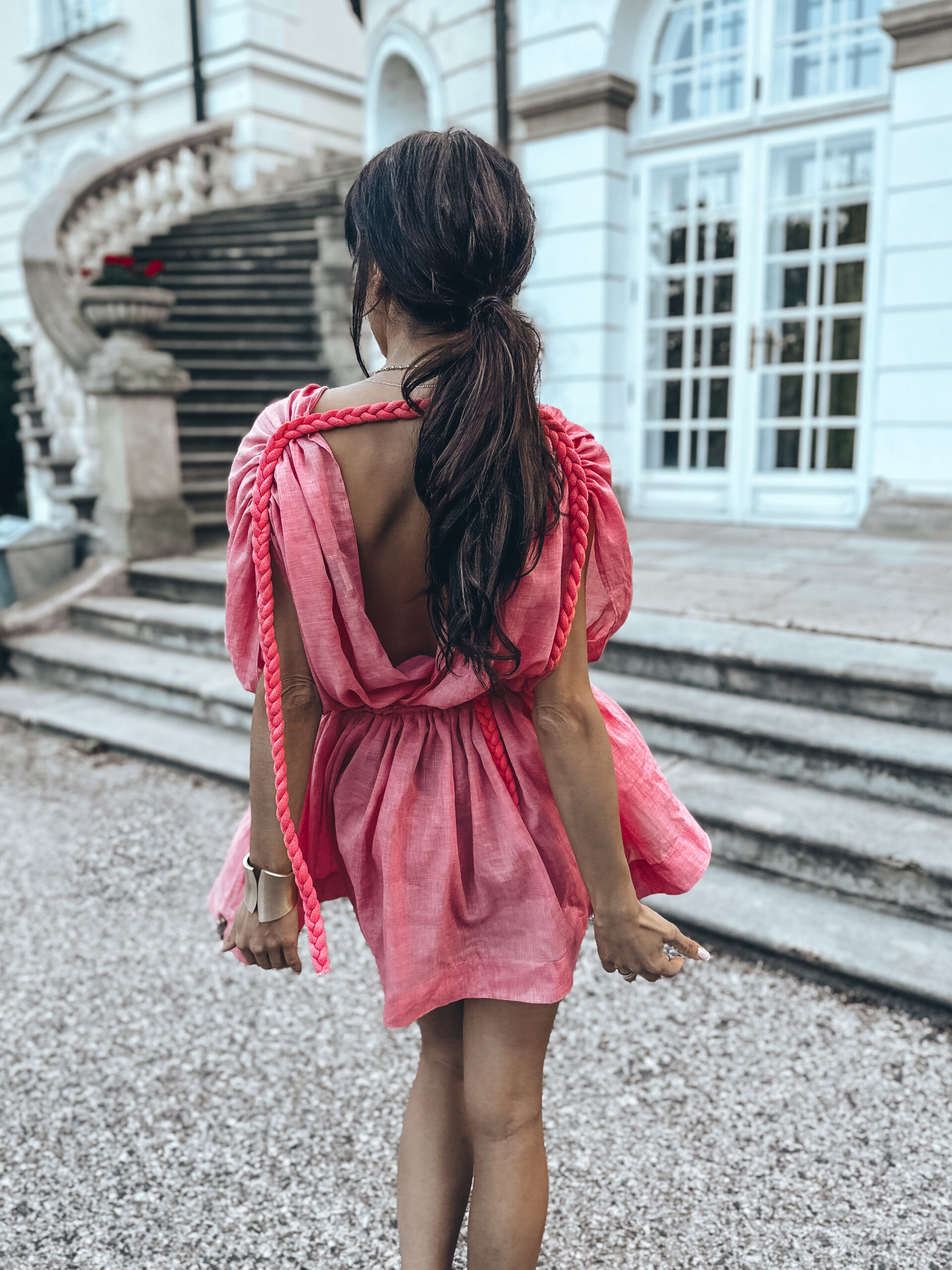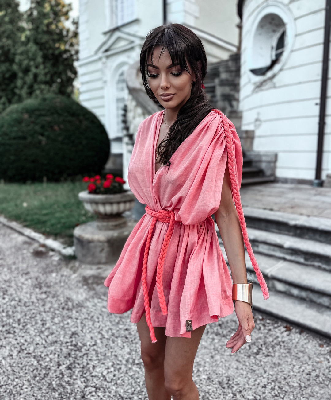 Sukienka wykonana z bawełny z dodatkiem viscozy. Rozkloszowana u dołu . Gumka w pasie , możliwość regulacji sznurkiem który jest dodatkowo przyszyty do połowy pasa . Idealna na plaże w gorące dni .