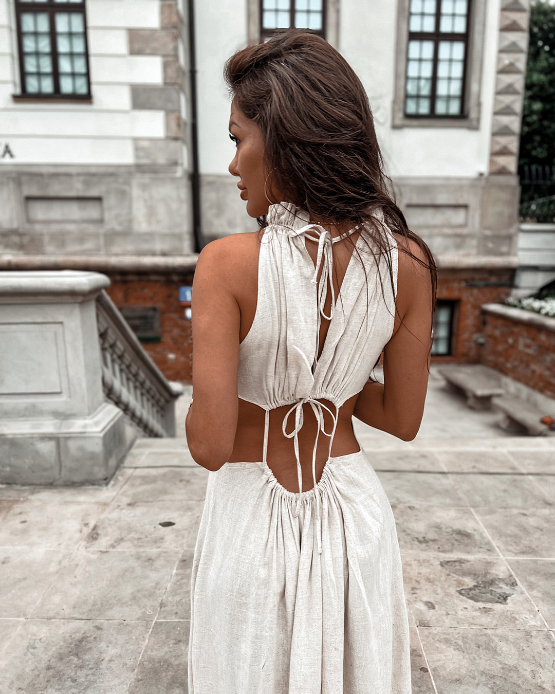 Sukienka maxi wykonana z lnu, z dodatkiem wiskozy. Regulowana sznurkami.