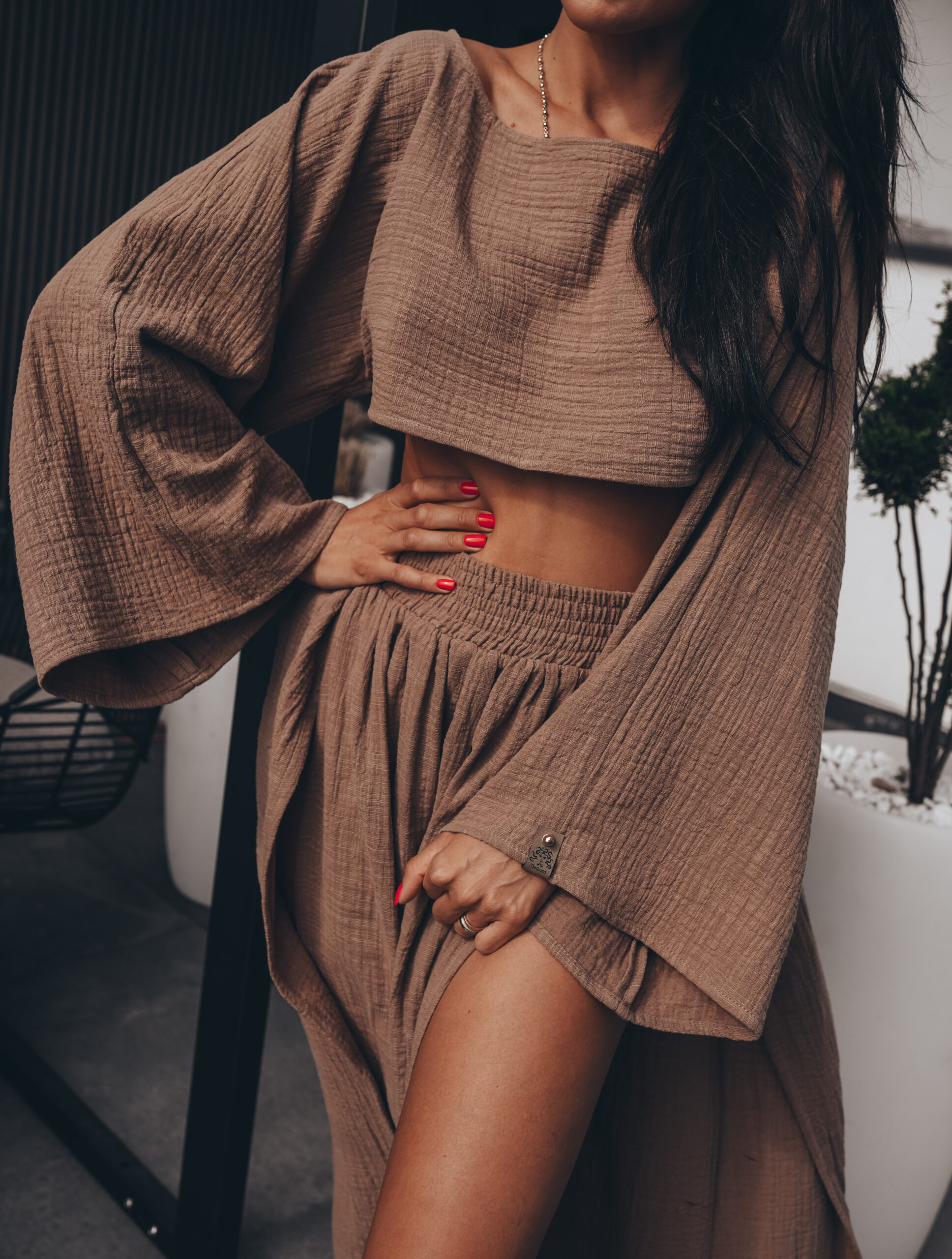 Bluzka typu oversize , rozkloszowane rękawy . Spódnica rozkloszowana , gumka w pasie . Dwa rozporki.