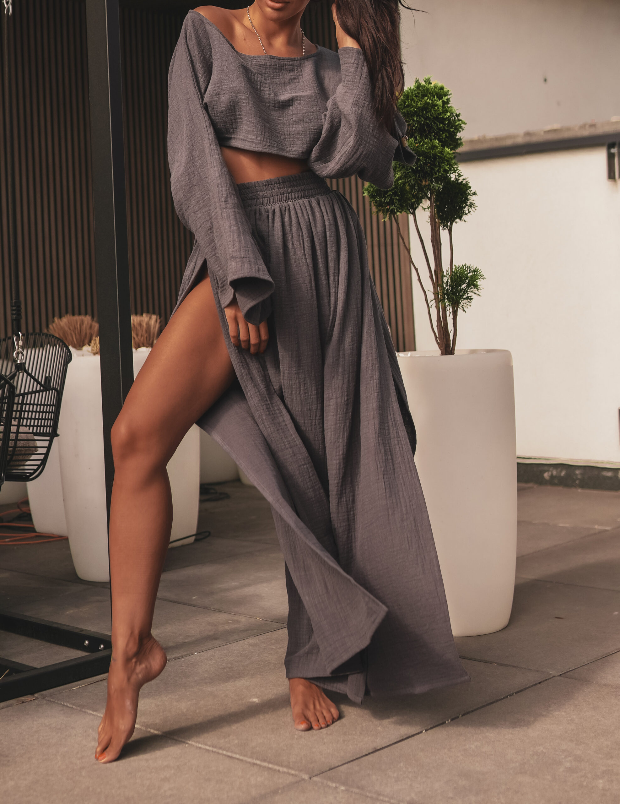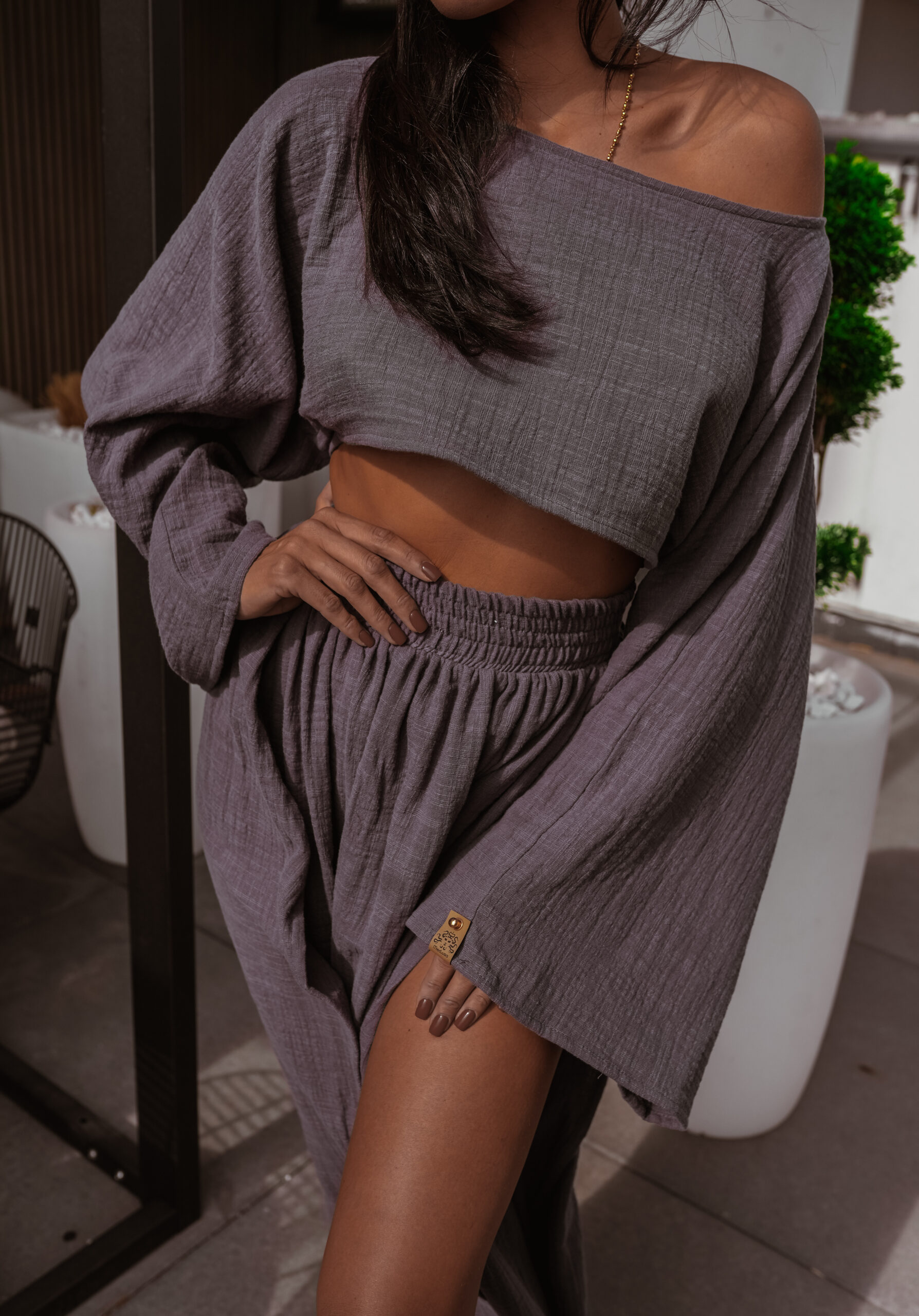 Bluzka typu oversize , rozkloszowane rękawy . Spódnica rozkloszowana , gumka w pasie . Dwa rozporki.