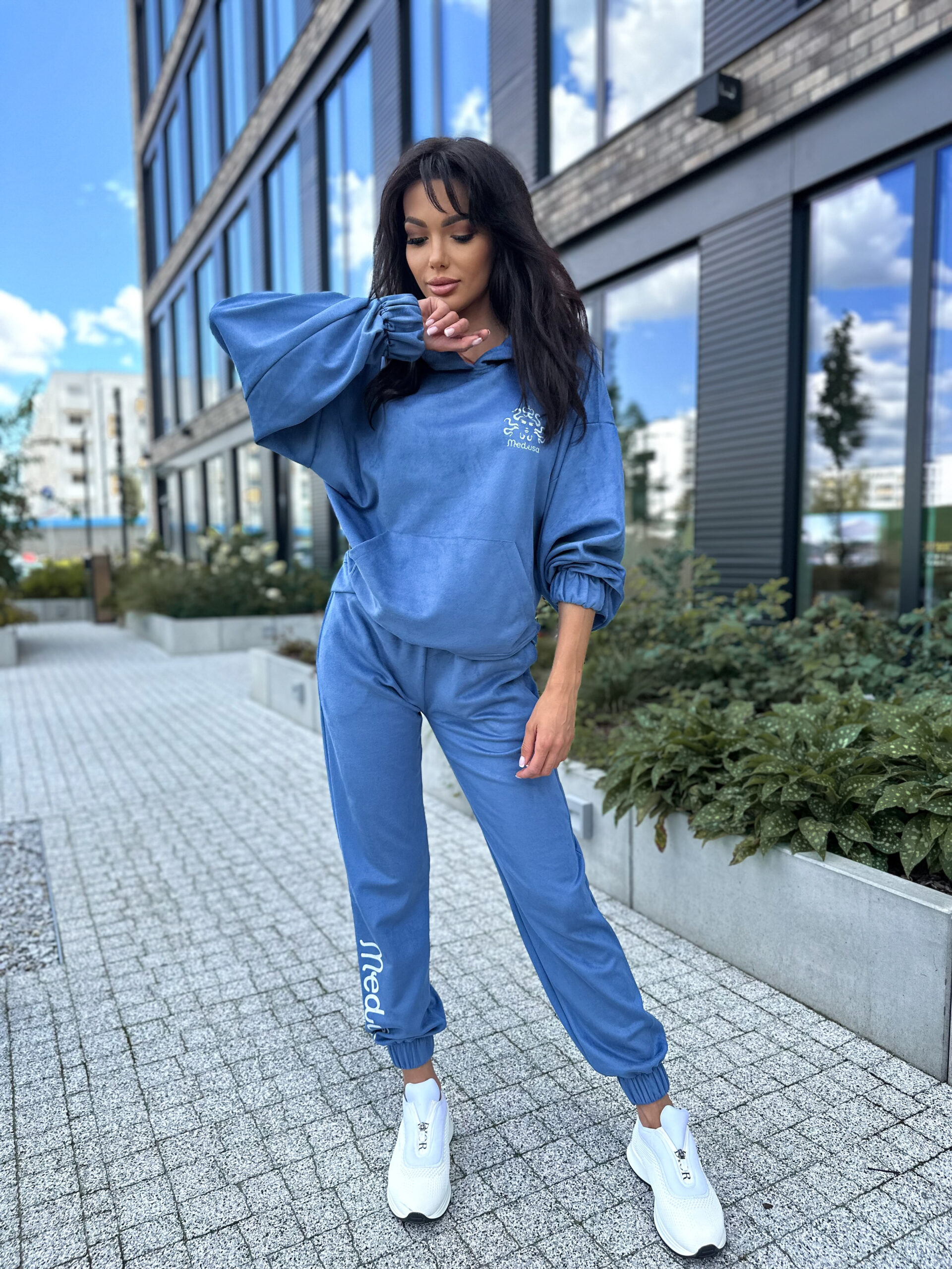 Bluza Zdobiona logo z przodu w kolorze niebieskim . Wewnątrz bluzy dresówka . Całość zdobi charakterystyczny oversizowy krój typu nietoperz .